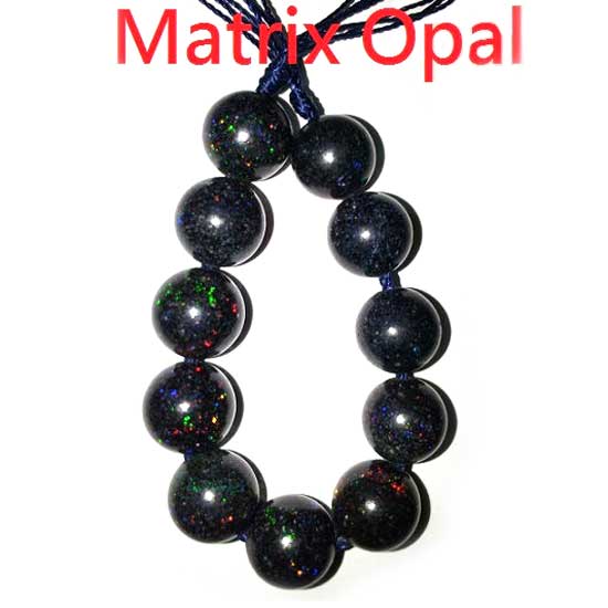 This row of beads is made of matrix opal for a fascinating touch. It features a smooth black exterior with green, red and blue details. This row of matrix opal beads is widely adopted in the jewelry making industry.
