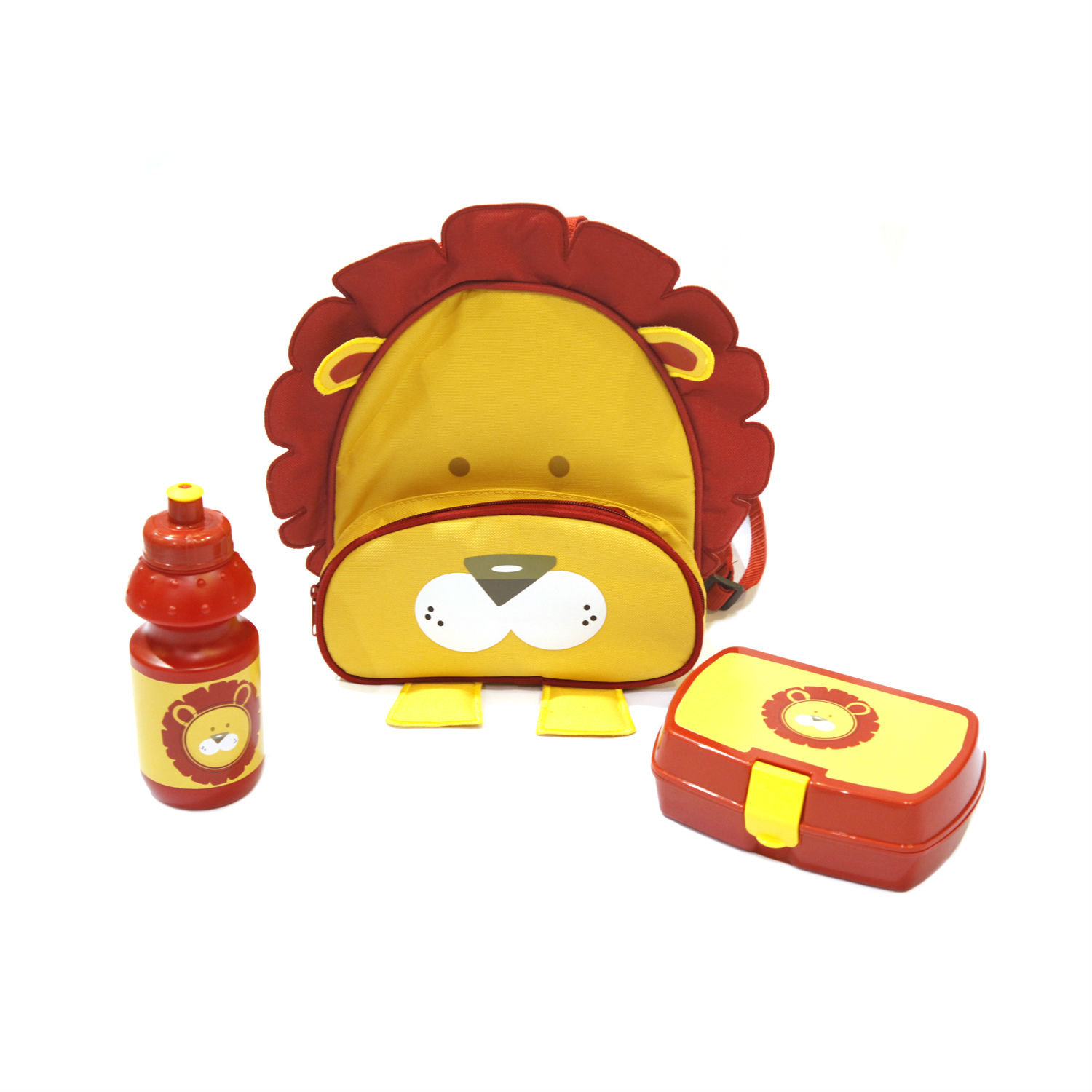 With a meal box and a bottle