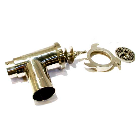 Pictured here are parts for assembling a meat mincer. They include the main body, worm, crossed blade and plate cutter. Made of stainless steel, these parts boast strong corrosion-resistance and high durability.