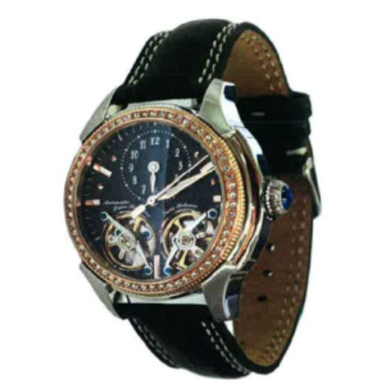 This photographed watch features a complicated, professional skeleton design on the dial. The textured bezel in bronze color offers a more mature sense of refinement. The white stitching on the black straps contributes to a low-profile elegance.