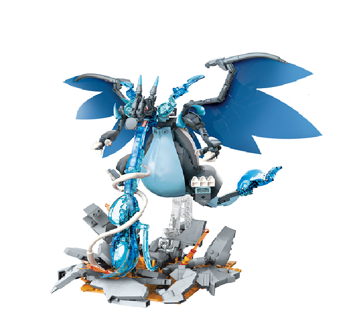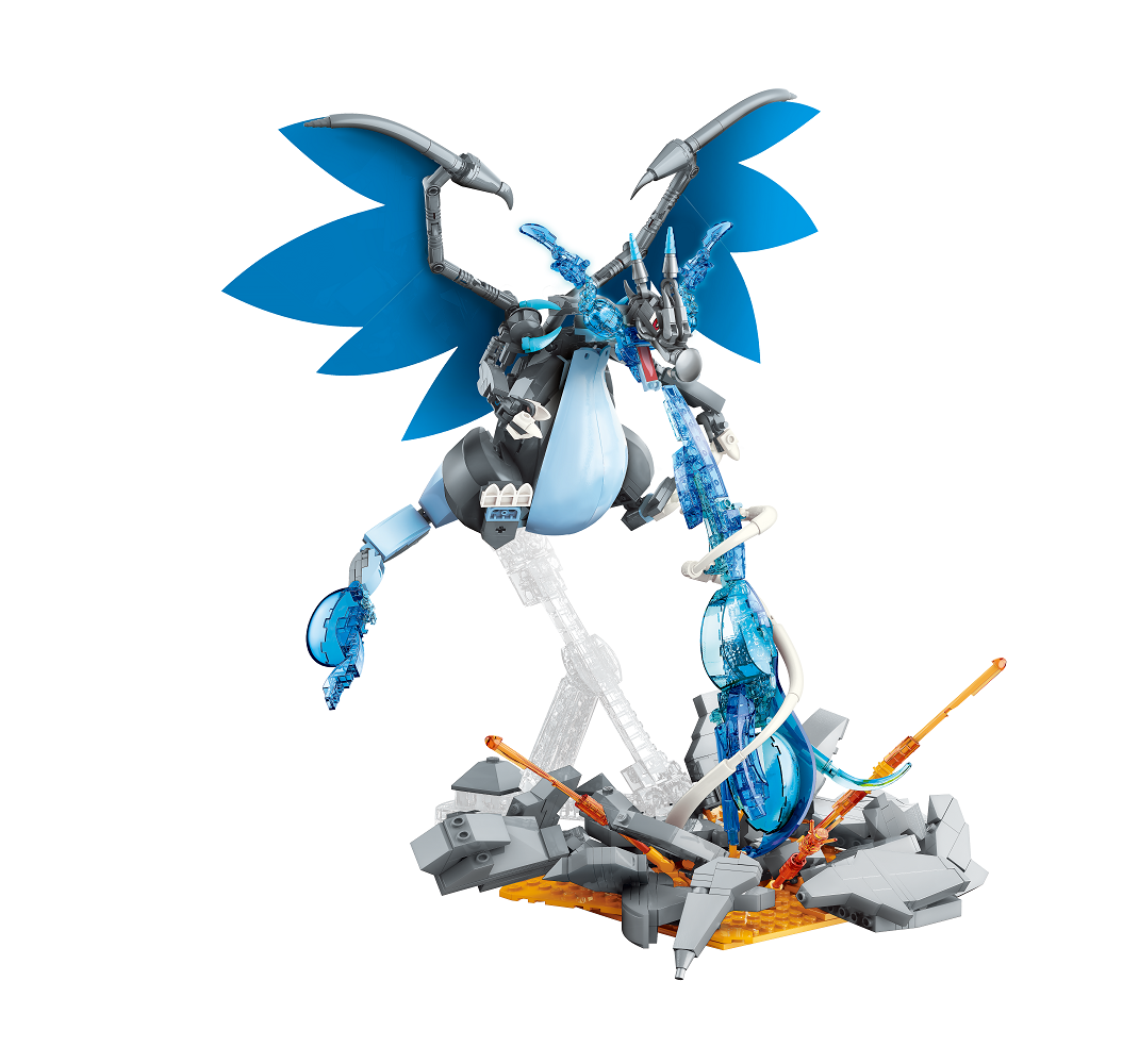 Highly restore the Alain's Mega Charizard X whose skin is grey-black, whose shoulder is with blue claws, and whose mouth is breathing blue flames.