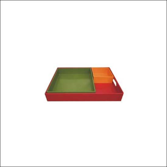 It consists of a big red retangular tray, a green square tray and a small square orange tray