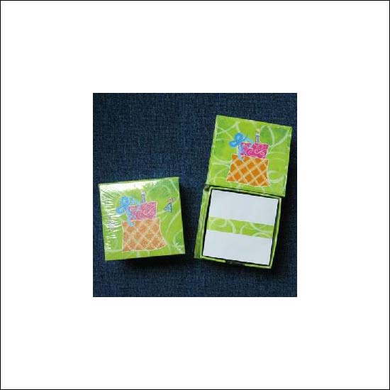 The memo pad is green in color and it is decorated by a cake-like fugures