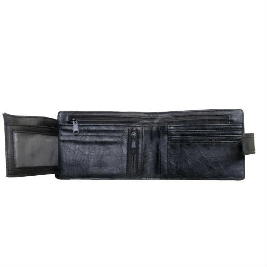 Men's wallets with tab closure and metal plate on front, inside with credit cards holders, ID holders and bills holders.