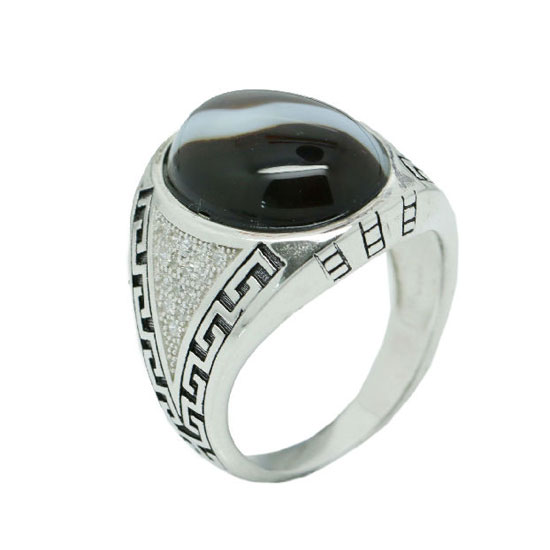 This is an agate ring in a silver setting for men. The black agate cabochon is finely polished to offer irresistible luster. It brings out your unique personality.