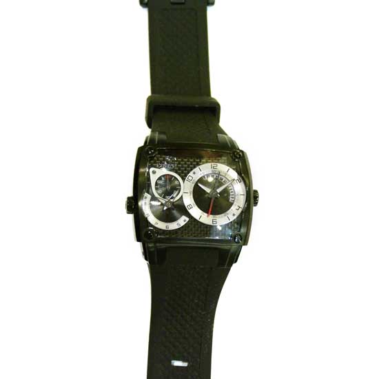This men's analog watch features two main dials and a sub-dial. The watch face is adorned with unique herringbone patterns. The watch offers dual time display, offering added function to the wearer.