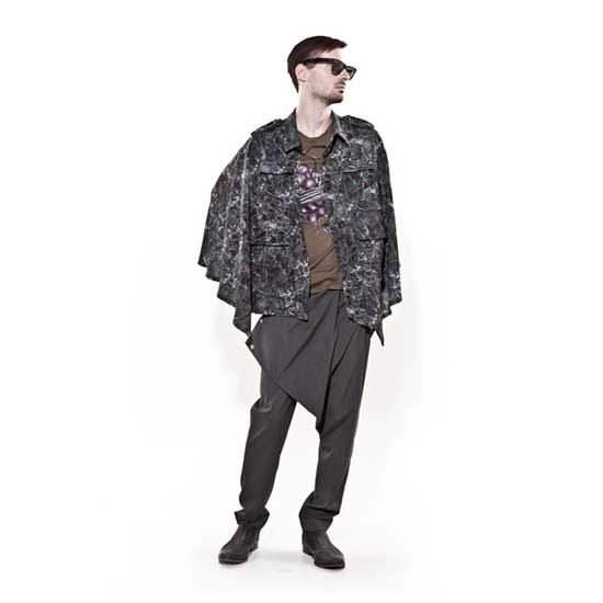 This men's apparel set comes in a stylish combination. The sandblasted jacket boasts a pair of dolman sleeves, while the shirt features fancy galaxy prints. The front of the pants flaunts flap-over detailing for a cool appearance. This men's apparel set will crown you the master of fashion.