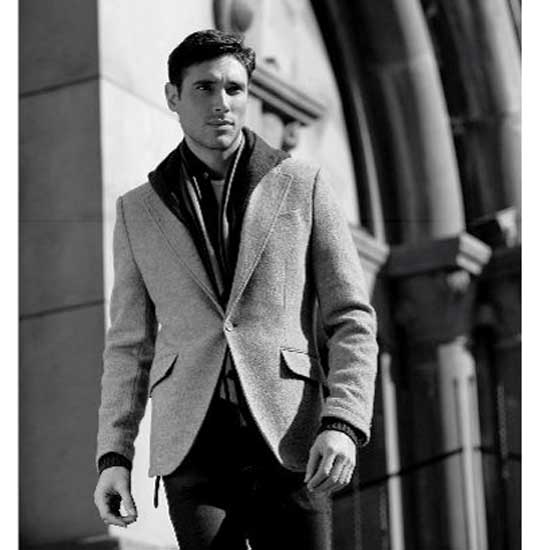 Featured is a men's woven blazer with inner hand hood. The blazer is fully lined with a notched lapel and one-button entry. The three pockets are designed to store personal items.