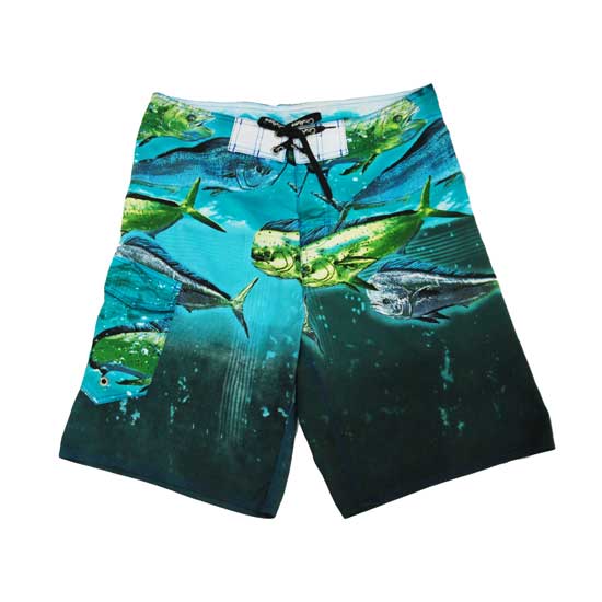 This pair of men's boardshort features fish designs on the green surface. The finely manufactured polyester shorts delivers satisfying wearing comfort. The well-designed pair of shorts is a great addition to your summer wardrobe.