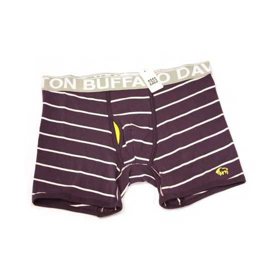 This is a pair of men's boxers in dark purple. It is printed with white horizontal stripes in white for added uniqueness. The soft fabric promises enhanced comfort.