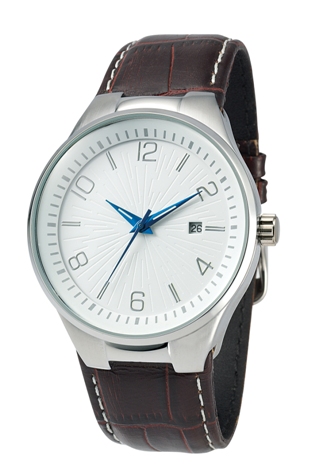 Here features a sleek and stylish watch for the modern men. This silver tone brass case watch with IPS plating has a round face with white structural dial, blue hands with luminous markings on hour and minute hands, and a small date window at 3 o'clock. It also features silver tone hourly indexes with alternate Arabic numeral markers. The brown genuine leather strap has white stitch detailing and crocodile pattern. This cool 3ATM water resistance watch uses the Japan 3 hands date movement, and it will complete your outfits with a polished finish.