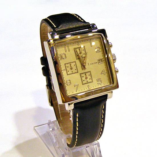 This is a men chronograph with stainless steel case. This chronograph is fitted in a square case and three small square dials design. Made with high quality movement, this watch is durable and reliable.
