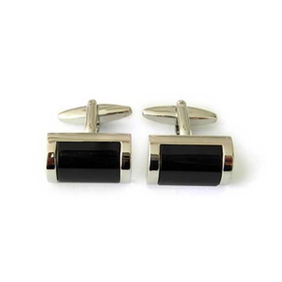 Showcased is a pair of cufflinks boasting an elegant design. The cufflinks come in a puffed rectangular shape in lustrous black. The silvery settings are polished with a mirror finish.