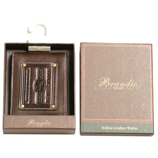 Featured here is a men's leather wallet. The front panel comes with a leather patch with embossed logos and words. The four studs and visible stitches bring added style to the wallet. The exquisite wallet makes a great gift for men.