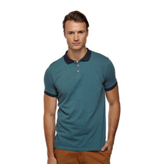 This polo T-shirt comes in an ocean-blue color. It features a contrasting black-colored collar and trims. This versatile polo T-shirt is an essential in your ready-to-wear wardrobe.
