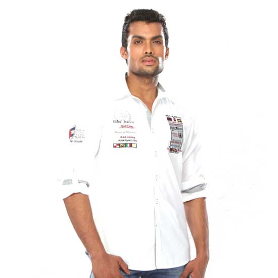 Featured here is a full-sleeve white poplin shirt without pockets. Multi-color print and embroidered graphics on chest and sleeves add an exuberant touch to this garment. This slim fitted men's shirt is a fashionable choice for casual occasions.