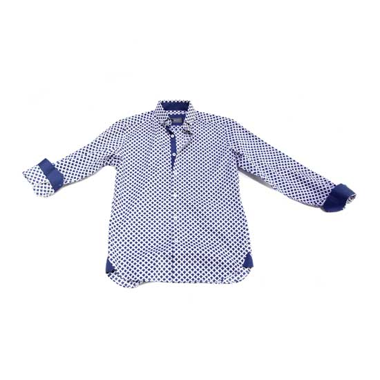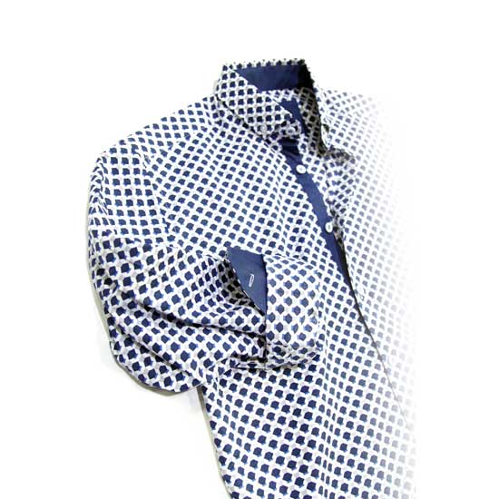 This is a men's shirt with a charming and fashionable look. It is made of full cotton for enhanced comfort. The shirt features a dark blue background and is printed with allover white diamond patterns.
