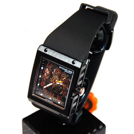 This watch has tank-shaped stainless steel case. Black tone watch has black PVD layered case and buckle and black plastic watch strap. Texas orange border detailing enhance this watch.