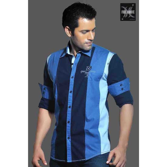 Shown here is a high-fashion cotton striped shirt designed in oceanic tones. Vertical stripe patterns effectively elongate the torso and attract attention. This well-made men's shirt is produced in nice detail.