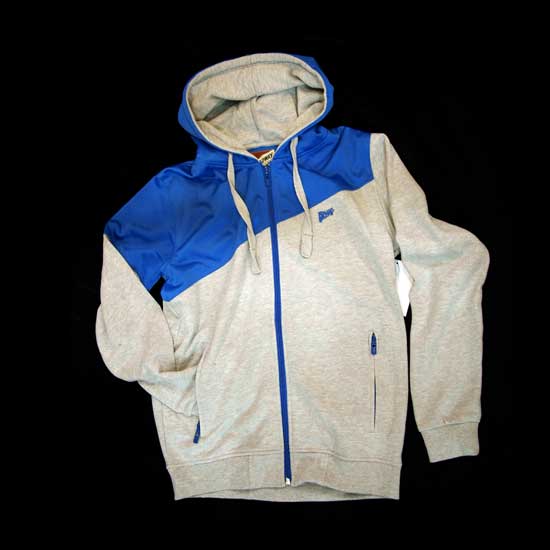 This trendy men's sweat shirt features blue and white construction. The sweat shirt is designed with a hood for added warmth and protection. The front zipper closure and two pockets finish the design of this functional piece.