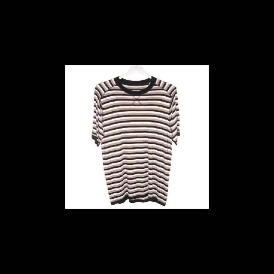 This soft t-shirt has thin horizontal stripes of brown, beige and white