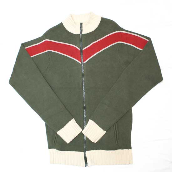 Shown here is a men’s sweater featuring a sporty design. The sweater comes in washed green, highlighted by a sharp red zigzag stripe across the chest. The zipper front allows it to mix and match with T-shirts.