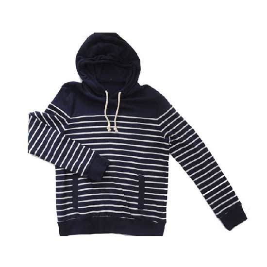 This pictured sweatshirt comes with a matching hood. The thin white stripes add a navy accent to the sweatshirt. This loose-fit sweatshirt goes well with jeans and sneakers for a laid-back casual look.