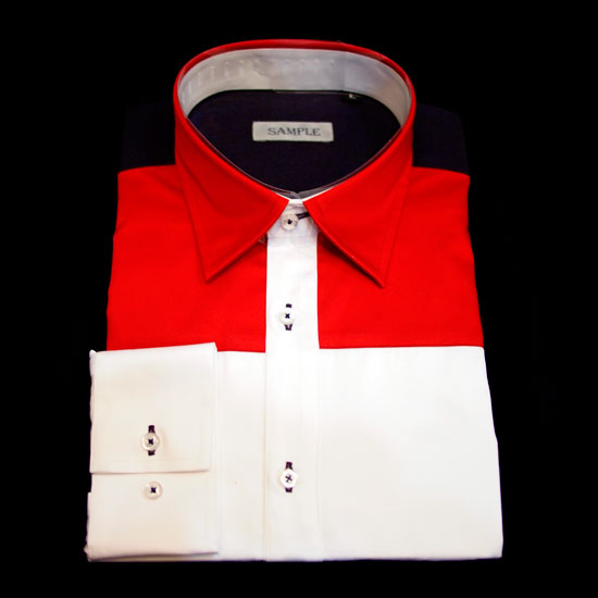 This men's two tone shirt features an eye-catching design in bright red and white. The tailored construction fits any wearer seamlessly. The white placket and detailed buttons lend extra detail to this garment.