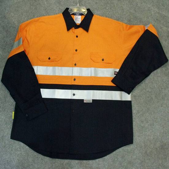 This long-sleeve shirt features a point collar and a seven-button front closure. It comes with two chest patch pockets with flaps and button closures. The loose cutting offers a comfortable roomy fit. Made of a reflective material and easily-recognizable colors, this shirt is ideal for use as a work uniform for various industries.