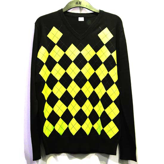 This men's pullover features alternate yellow and black rhombus patterns. The sharp yellow color adds vividness to this plain black pullover. Made of 100% cotton, this V-neck pullover is very soft and comfortable to wear. This beautiful pullover is ideal for men to wear in winter.