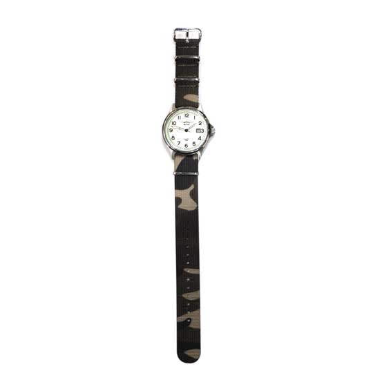 This is a men’s watch that runs on a high-precision quartz movement. The white dial face has three hands, an Arabic numeral display and a date window display. The nylon strap features an attractive camouflage design.