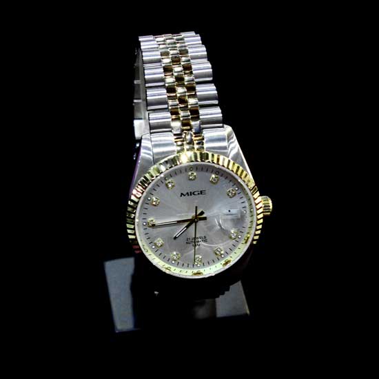 This is a fashionable mechanical men’s watch that comes with a refined and luxurious design. Adorned with sparkling stones, the round bezel shimmers with a highly glossy finish. The classic round dial face has three hands and stone hour markers.