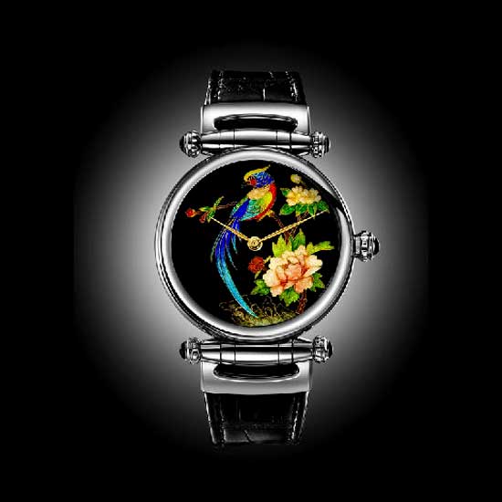 This men’s watch comes with a leather strap for a long service life. The round dial is crafted with delicate floral and bird patterns in bright colors for an eye-catching look. This quality watch boasts 50m water resistance for added functionality.