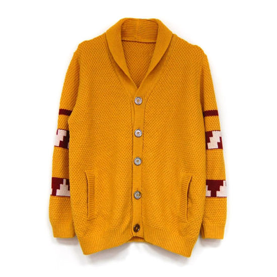 This men's wool cardigan features a brownish yellow finish. The sleeves are adorned with zigzag patterns for a smart look. It is a perfect addition to your winter wardrobe.