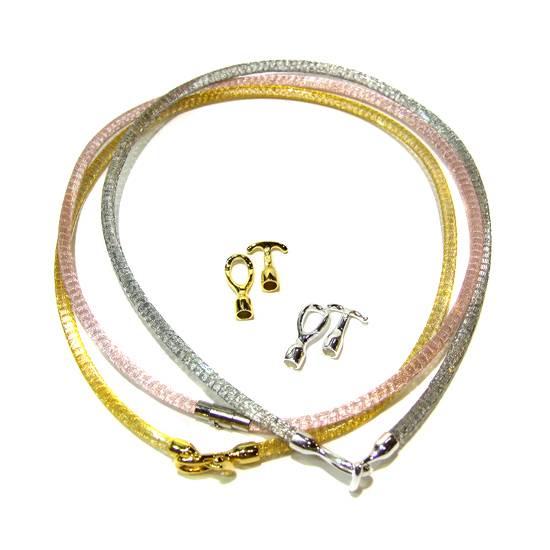 These are necklaces made of coloured meshes and silver findings. The meshes are available in various colours.