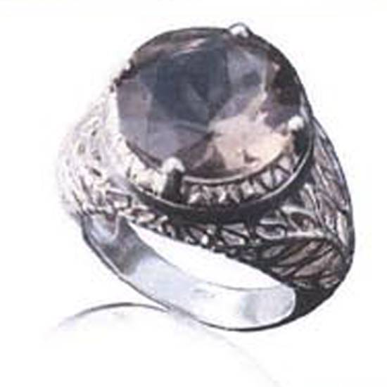 This metal ring has beautiful faceted stone in round shape and patterns on shoulder. The design reflects both modern and ancient world charm. New cuts heighten the intensity and color for rings.