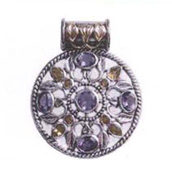 This round metal pendant has patterned wires and beautiful faceted stones in different colors and shapes. The round metal tube on the top has 3 stone ornaments. Ornate design are empowered with vibrant stones as well as reflecting both modern and ancient world charm.