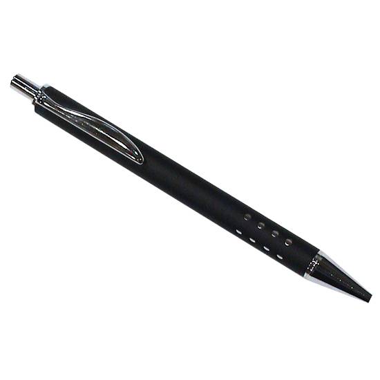 Featured here is a solid brass metal ball pen. It is of a clicky-top design. The glossy pen shaft is surrounded by a black cover.