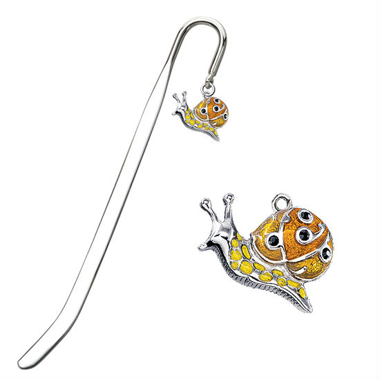 The epoxy orange and yellow colored snail dangle on this bookmark plays into a quirky feel, boasting dainty black stones to capture gazes. Its slim dragonfly design further finishes off with smooth nickel plating for a dose of cheery shine in between pages.