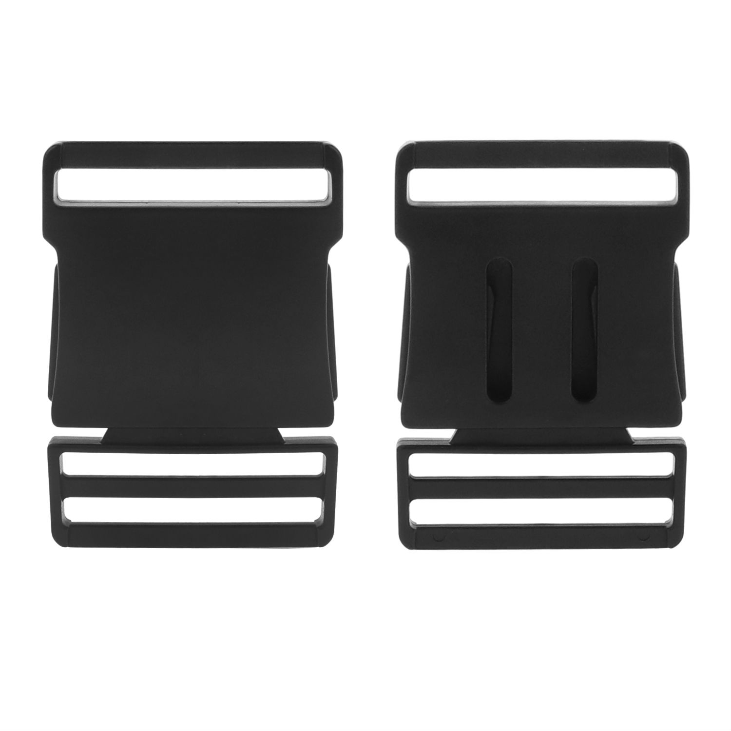 This side release buckle is made of alloy and comes with a two-part construction. It has holes on the body for webbing to pass through and can be used to adjust the length of straps. The side release buckle is perfect for connecting straps together and is a reliable component for backpacks, luggage, pet collars, and other items.