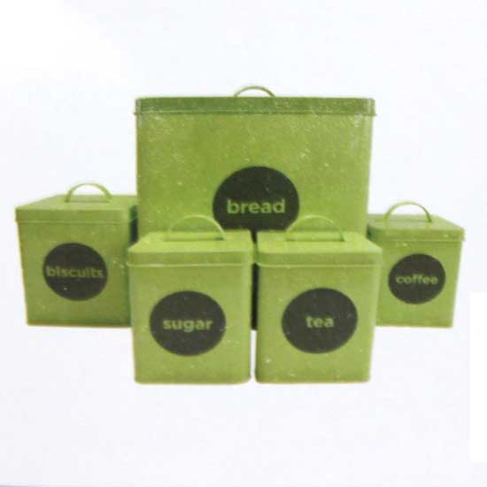 As shown is a nice set of canisters coming in a rectangular shape. The canisters come with a metal structure with the surface plated in fresh green. Handles are added on the kids for handy use.