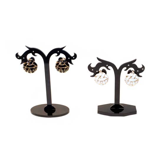 The displayed pair of round earrings is constructed of metal. The round earrings feature black woven patterns for added style. These dainty metal earrings are easy to mix and match.