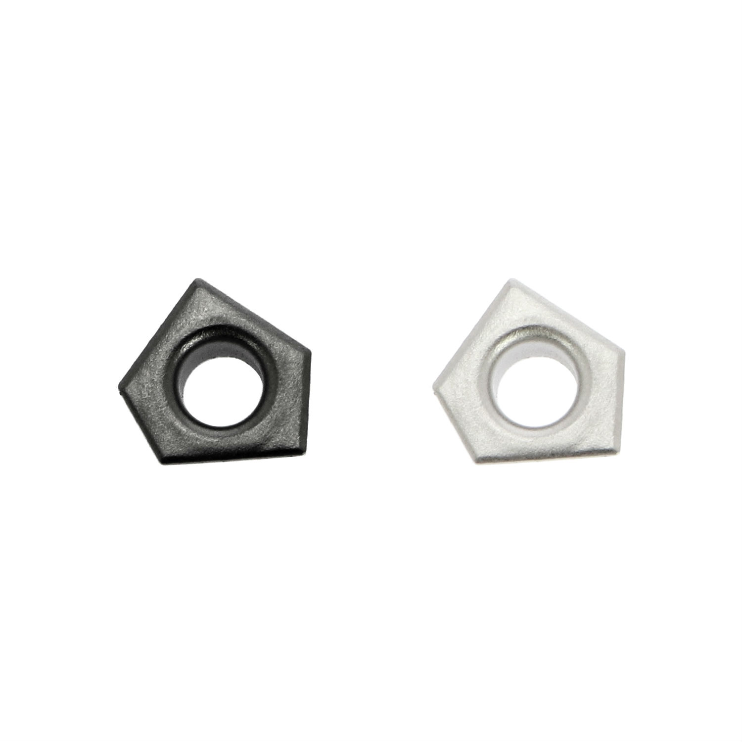 Featured here is a brass eyelet with an irregular pentagon shaped surface. It has a plated exterior and has a round hole in the center for cords to pass through. This brass eyelet is perfect for reinforcing holes and is suitable for clothes, leather, paper, shoes and so on.