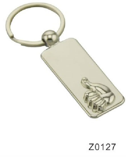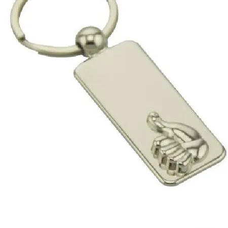 Highlighted here is a key ring for gift and souvenir use. It is made of metal and is has a rectangular plate with a thumbs up logo. This keychain has a round split ring for attachment and can keep keys well organized.