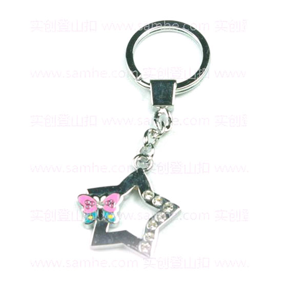 This is a metal keychain with a high-gloss finish. It features a strong ring and a star-shaped charm. The colorful butterfly accent on the charm highlights this silvery keychain.