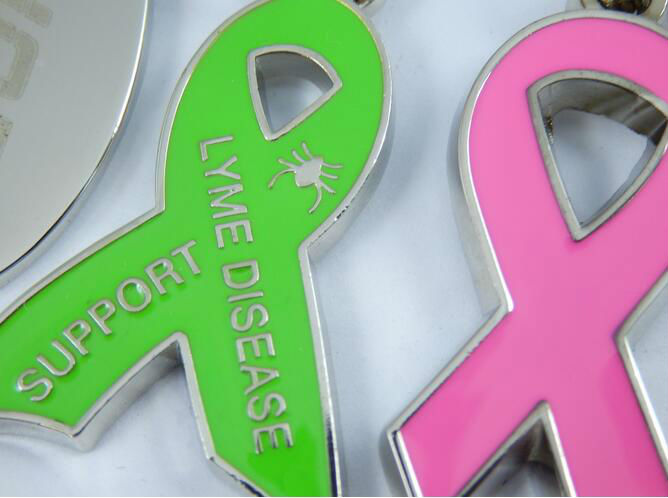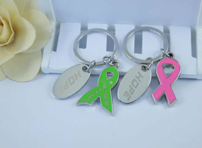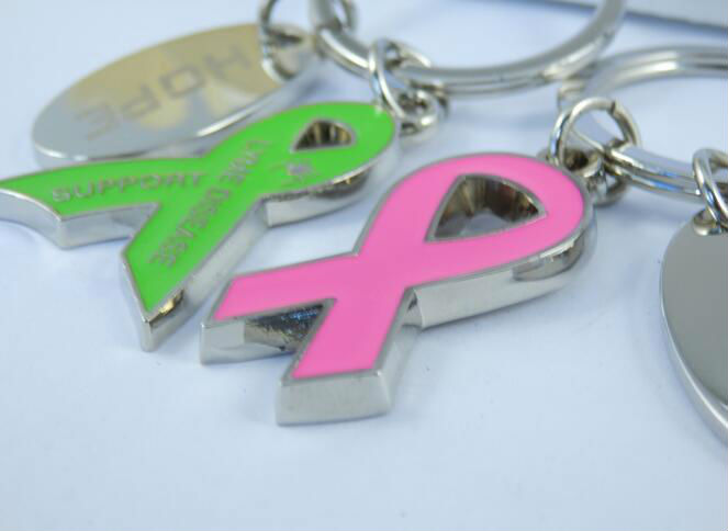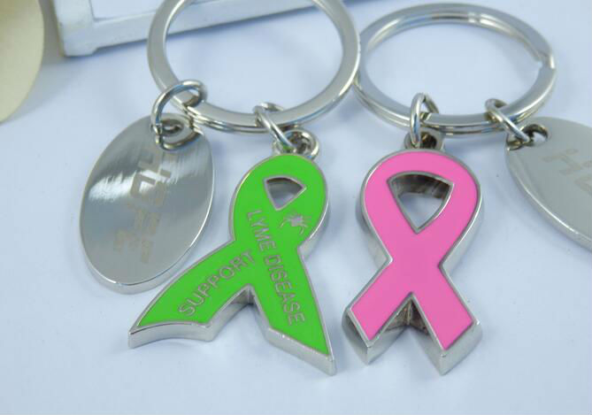 4.Production of metal love ribbon shape keychain:enamel, photo printing.