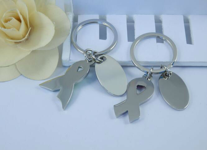 metal love ribbon shape keychain displayed is made of zinc alloy material