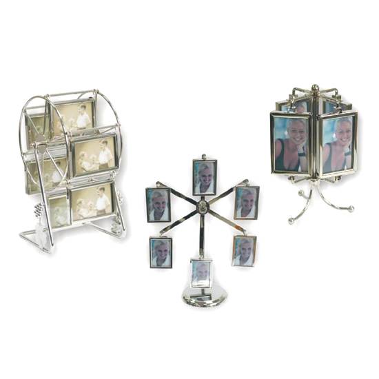 There is a set of three photo frames which is made of metal. The metal photo frame is in ferris wheel outlook. It has a stable stand.