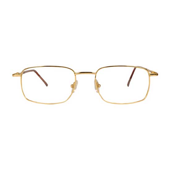 As shown is a spectacle frame made of metal. The golden frame comes with a full-rim design. The nose pads are adjustable for fitting the shape of your nose.