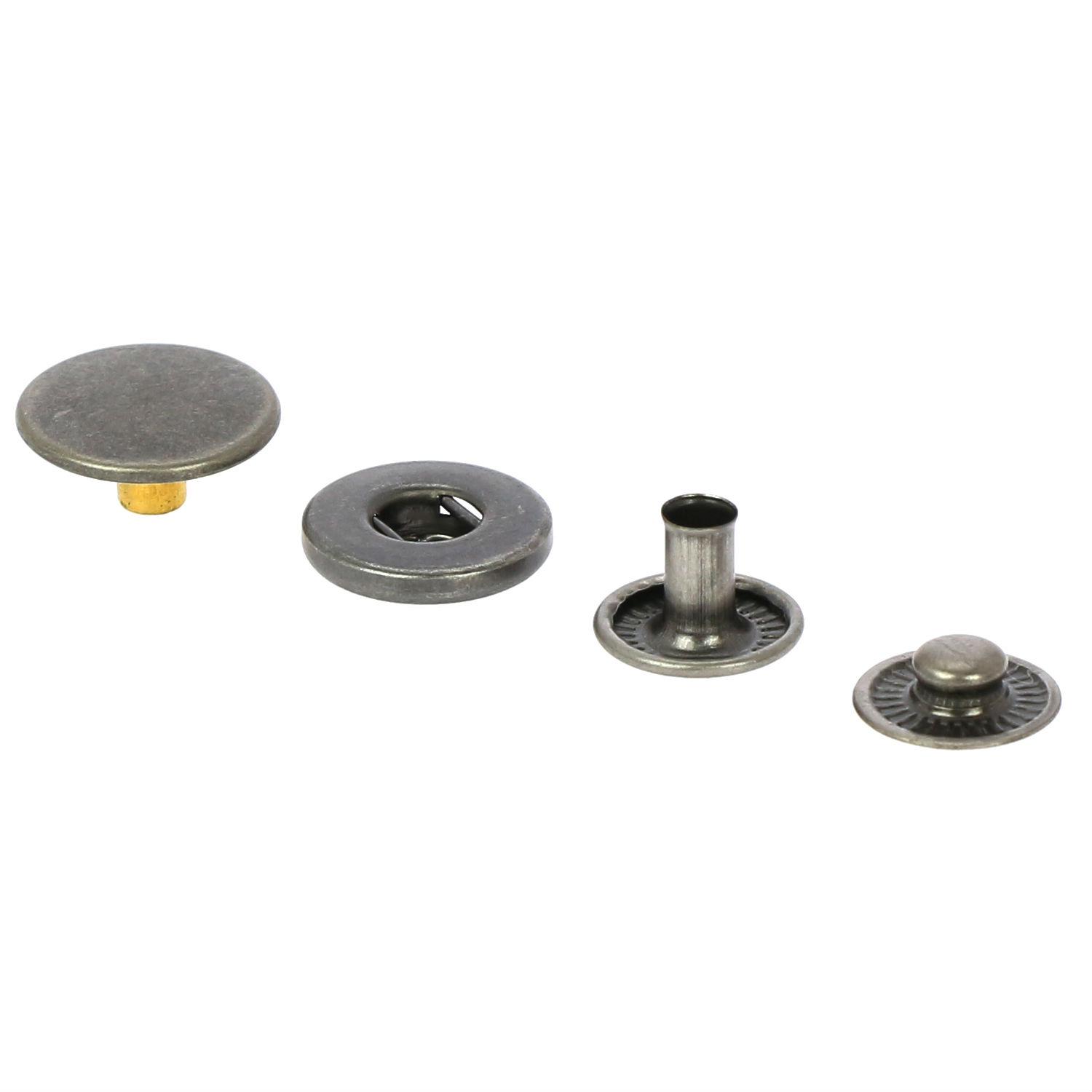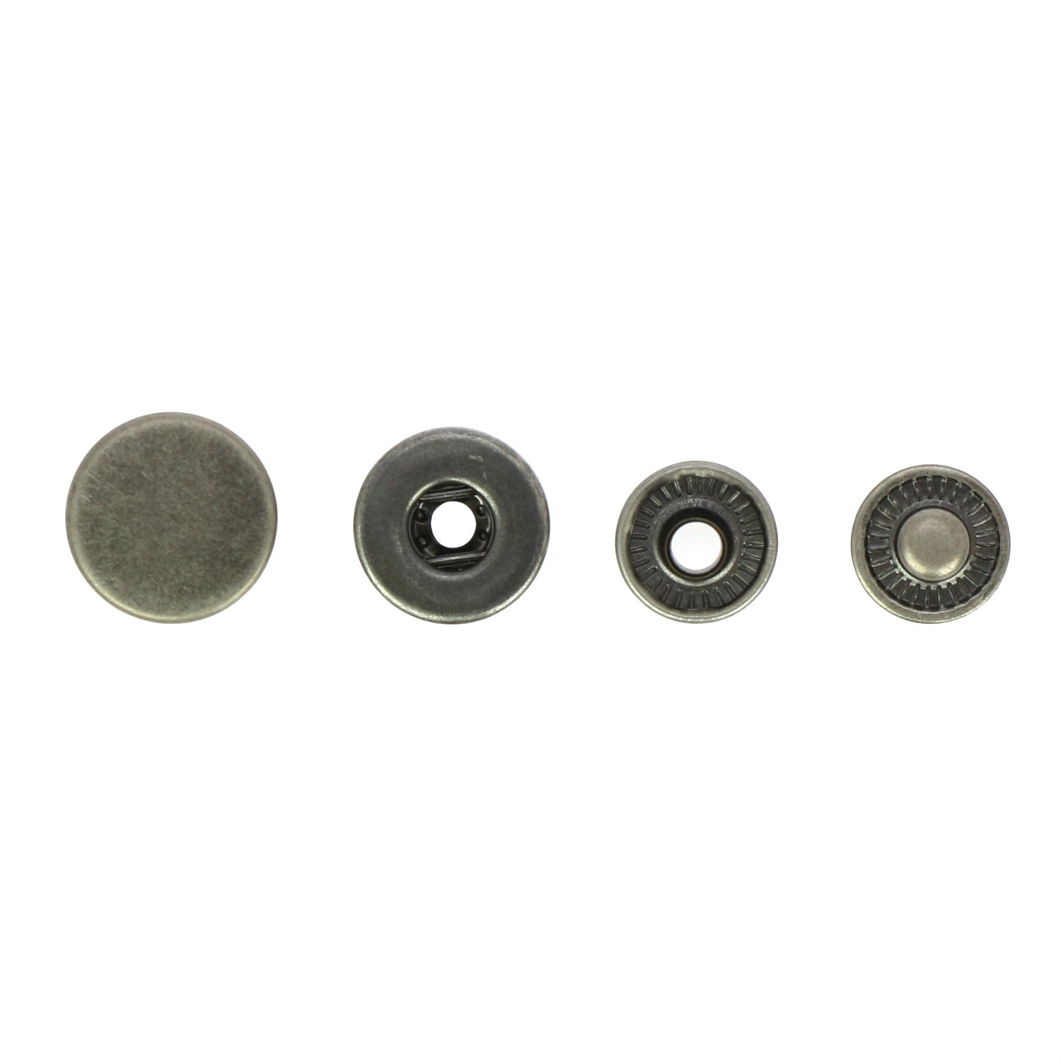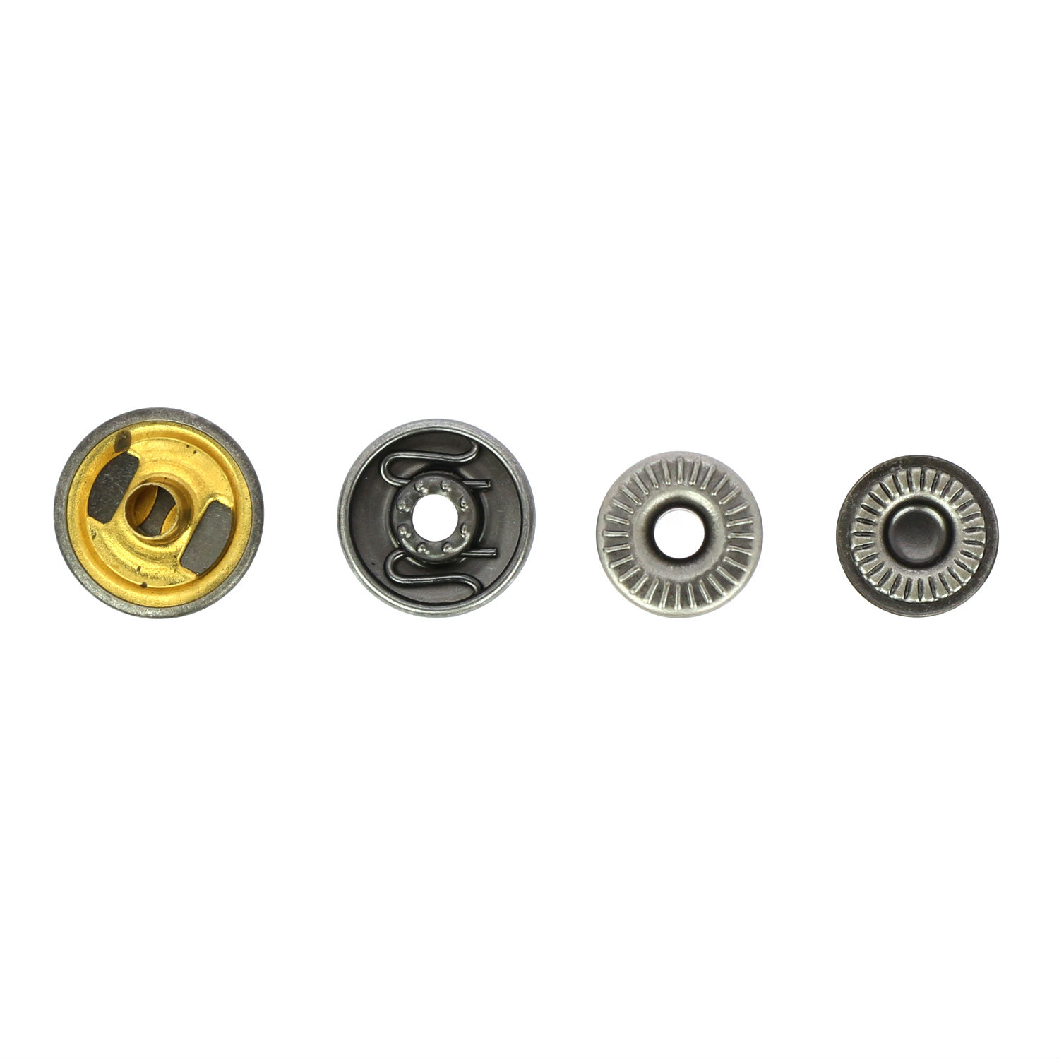 Highlighted here is a brass spring button with plated finish. It comes in round shape and features a multi-part structure. This button is effortless to install and provide reliable fastening for clothes, pants, bags and more.